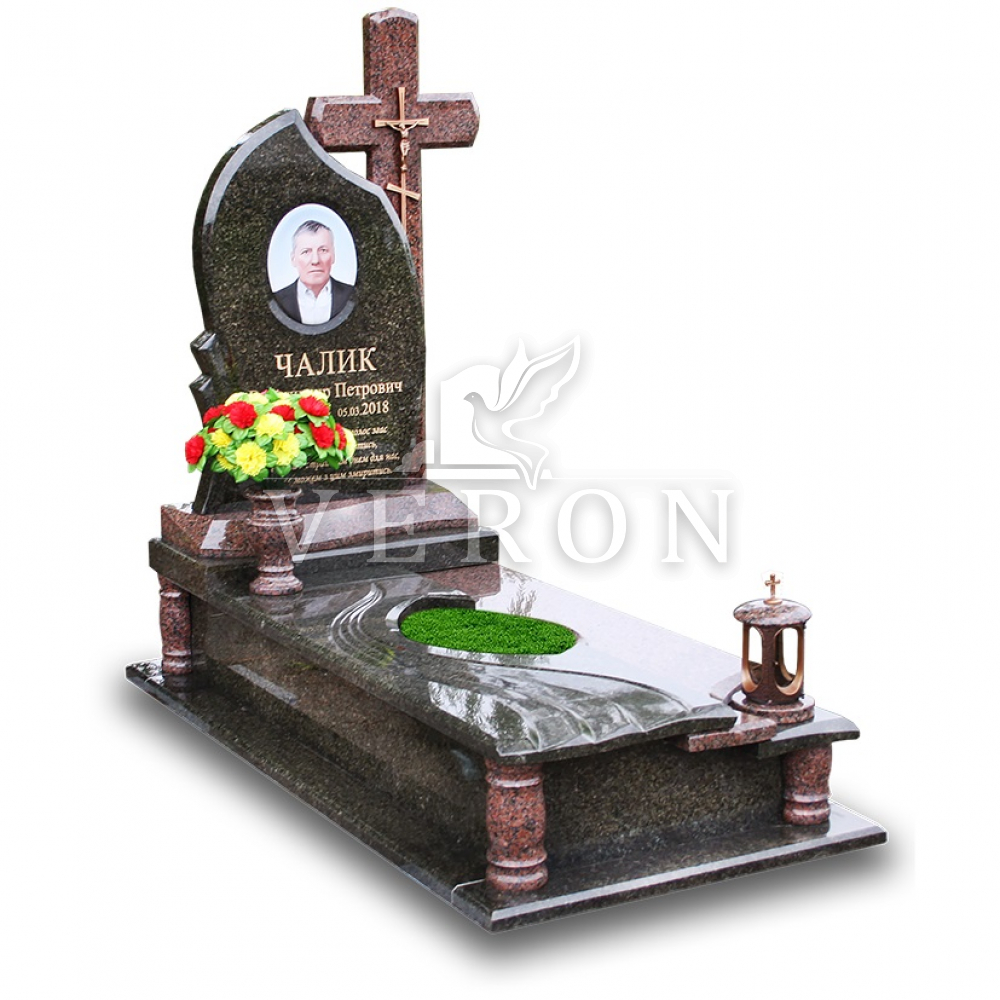 Верхня частина складається з однієї стели овальної форми та  окремого гранітного хреста,також присутня керамічна плитчина  для нанесення фото портрету